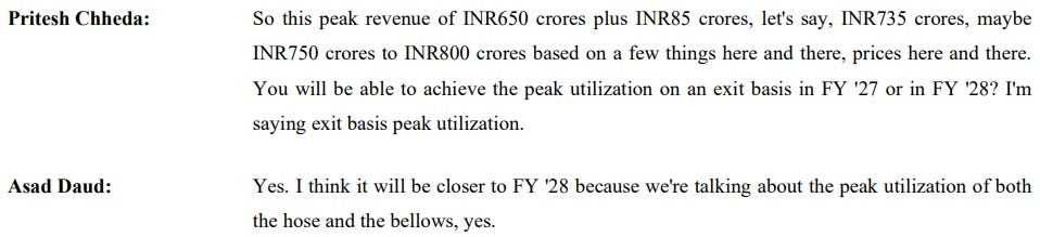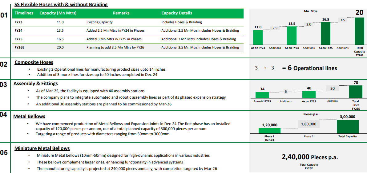 Returns expected to rebound: As high-margin bellows, miniature parts, and composite hoses begin contributing from FY26 onwards.
