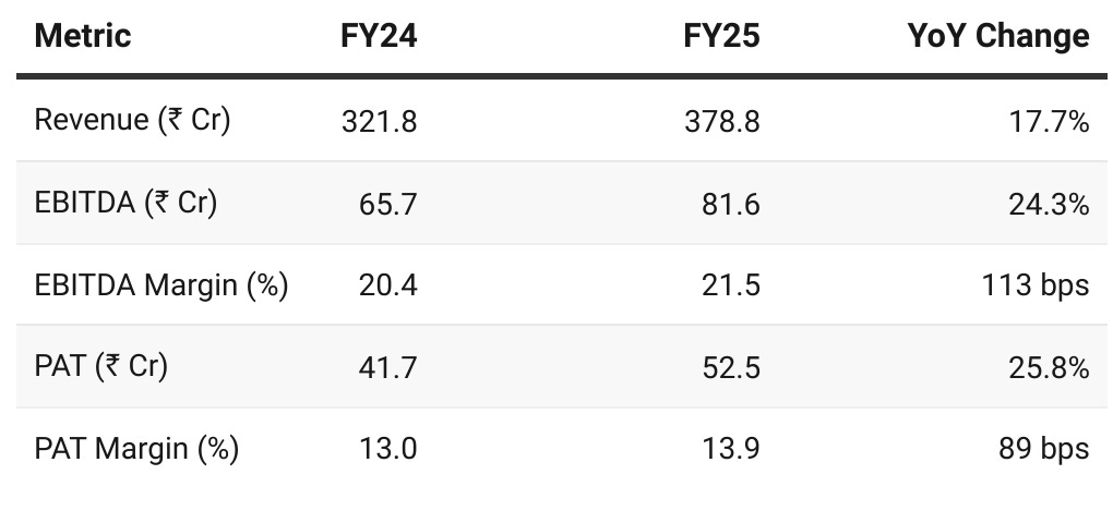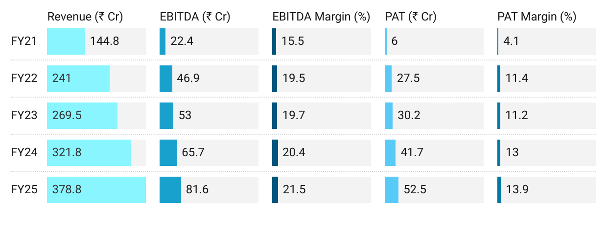Export-driven (~74% revenue), asset-light, high-margin model (FY25 EBITDA margin: 21.5%)