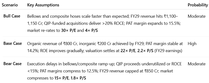 If Aeroflex reaches ₹1,000 Cr revenue by FY29 with stable margins, EPS will more than double, and at CMP will reflect ~18× P/E. That’s fair-to-attractive, especially given the asset-light, global export model and improving product mix. Valuation will look very reasonable — but depends heavily on 3-year execution across: