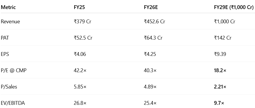 ₹1,000 Cr revenue by FY29, supporting FY29 EPS of ₹9–10 and P/E compression to ~18×.