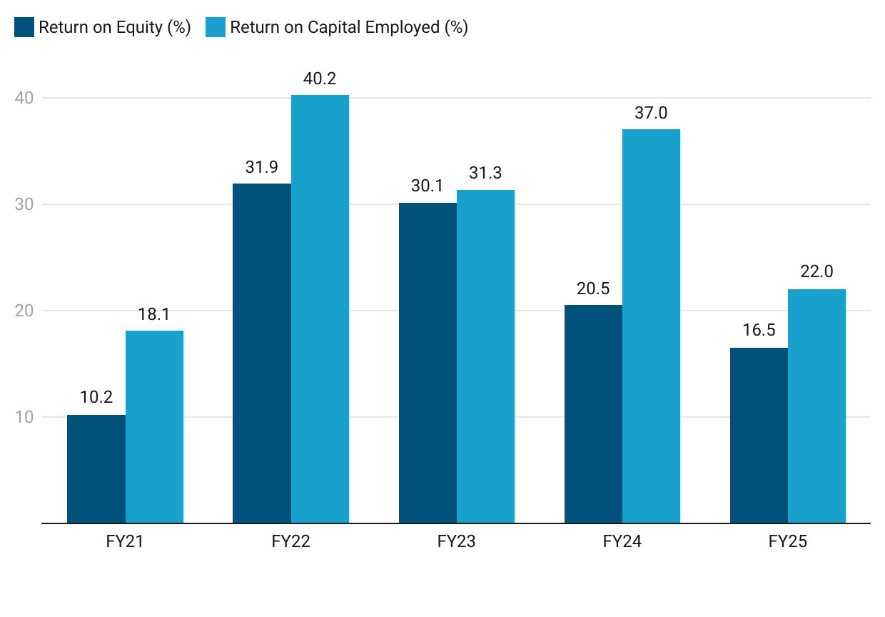 Decline in ROE/ROCE is temporary: Driven by front-loaded capex and balance sheet expansion, not operational weakness.