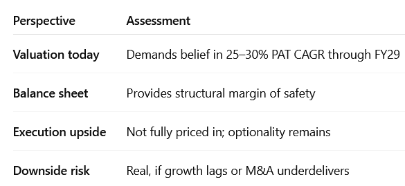 Management must execute on both organic scale and inorganic returns, while protecting margins. The valuation leaves little room for delays — but rewards for outperformance remain high.