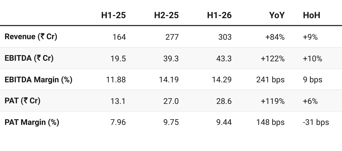 Strong performance in H1 FY26, marked by consistent growth across our key business segments. Revenue grew 84% year-onyear to ₹302.93 crore, while EBITDA and PAT more than doubled to ₹43.28 crore and ₹28.60 crore respectively, underscoring our operational efficiency and execution excellence.