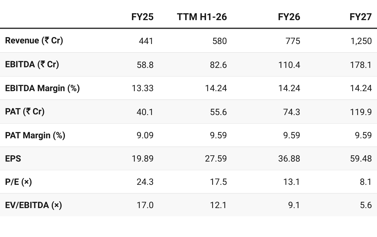 Expected revenue: ₹750–800 Cr (vs. ₹435 Cr in FY25 → ~75% growth).