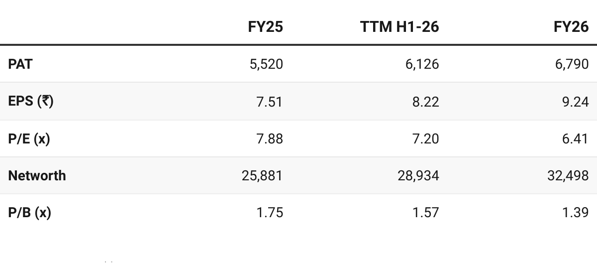 FY26E P/E = 6.41×, based on projected PAT of ₹6,790 Cr and EPS ₹9.24.