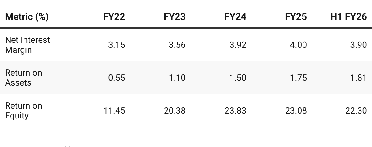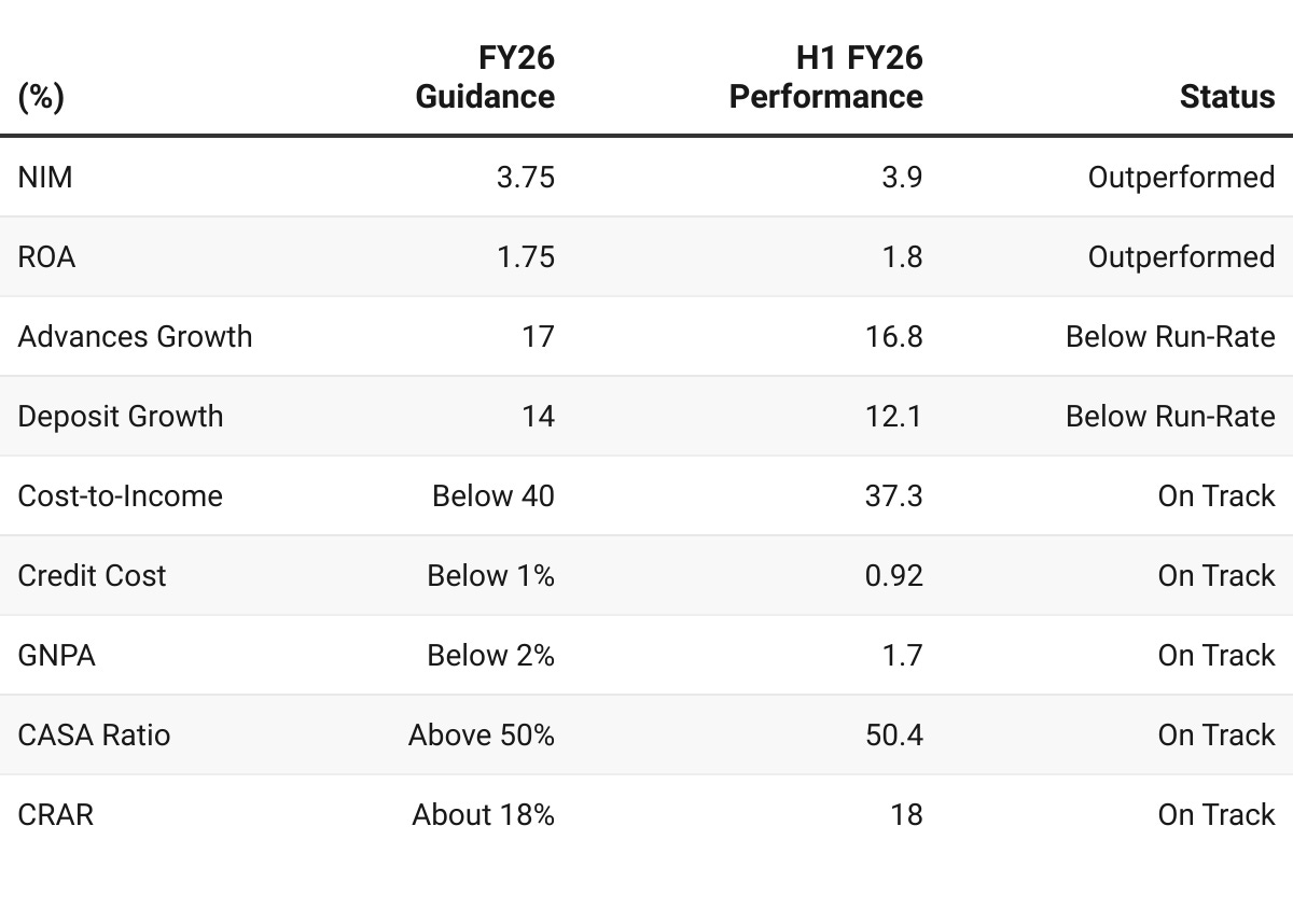 Solid execution in H1 FY26 with ROA and NIM above guidance. Deposit & advance growth trails run-rate, but strong execution leaves room for re-rating if targets are met.