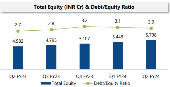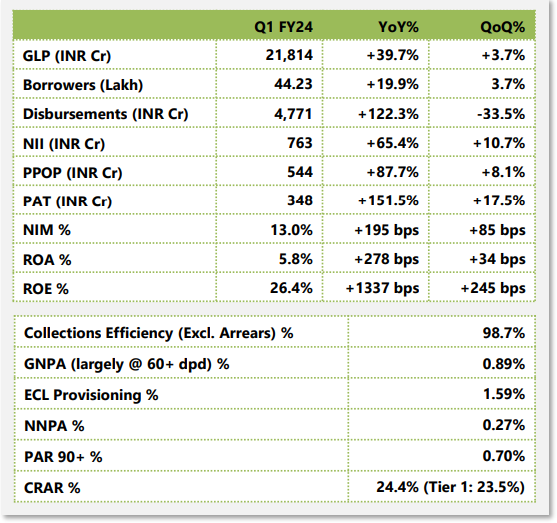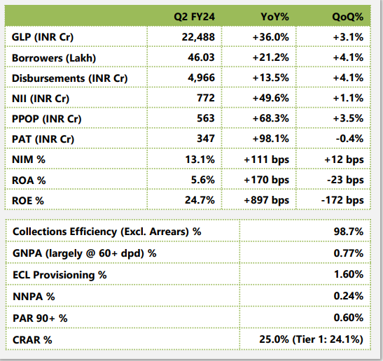 On the back of an improved income profile and a strong control on the cost of operations, our PAT grew by 98.1% YoY to INR 347 crore during Q2 FY24. This resulted in RoA of 5.6% and RoE of 24.7%.
