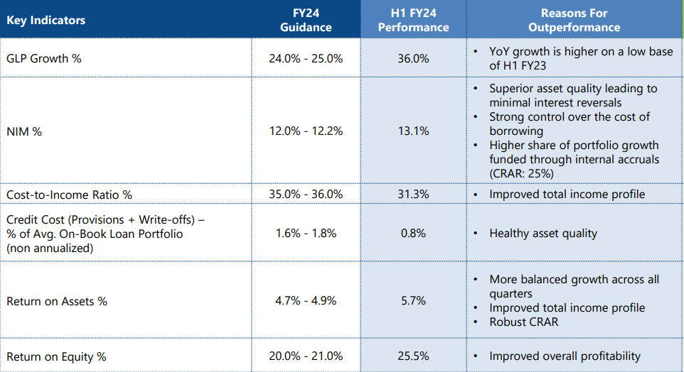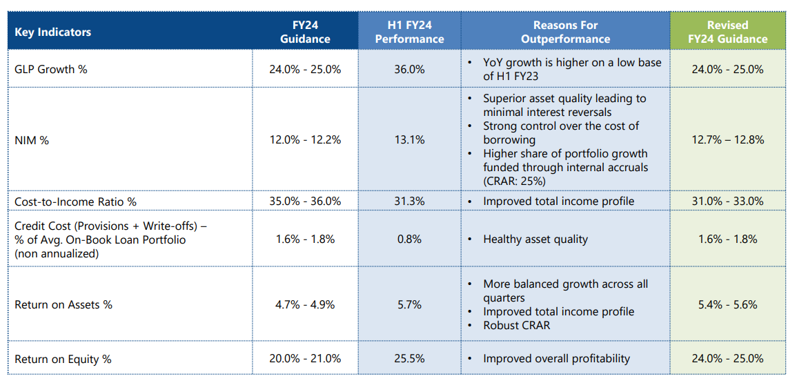 Considering strong business performance during H1 FY24, we have revised our FY24 guidance to achieve a portfolio growth of 24.0%-25.0%, NIMs of 12.7% - 12.8%, credit cost of 1.6% - 1.8%, ROA of 5.4% - 5.6% and ROE of 24.0% - 25.0%.