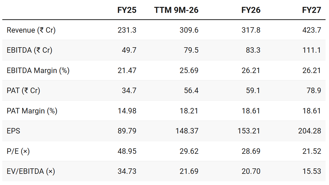 Valuations Already Reflect FY26: At ~29× FY26E and ~22× FY27E P/E, the stock is discounting management’s guidance, leaving limited room for re-rating unless earnings momentum continues into FY28.