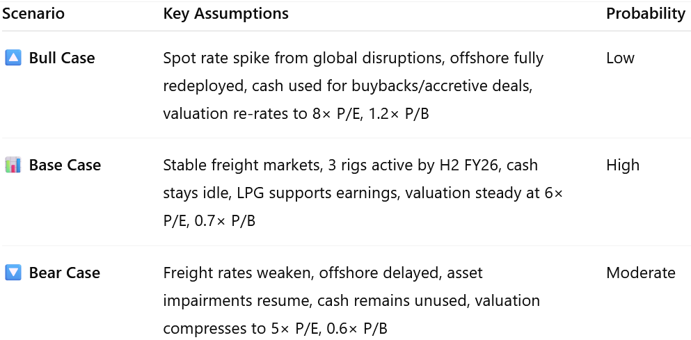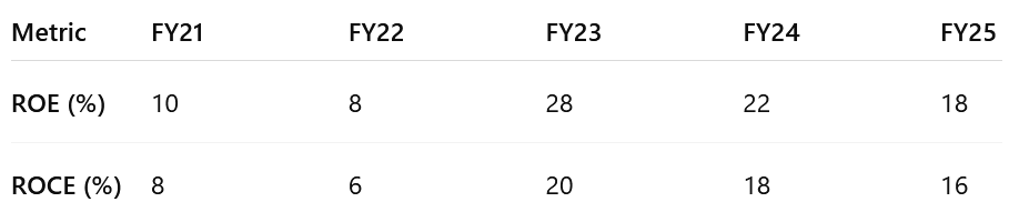 - FY24–25 Normalization: Returns moderated but remained strong due to cost control, stable LPG charter income, and a net cash balance sheet.