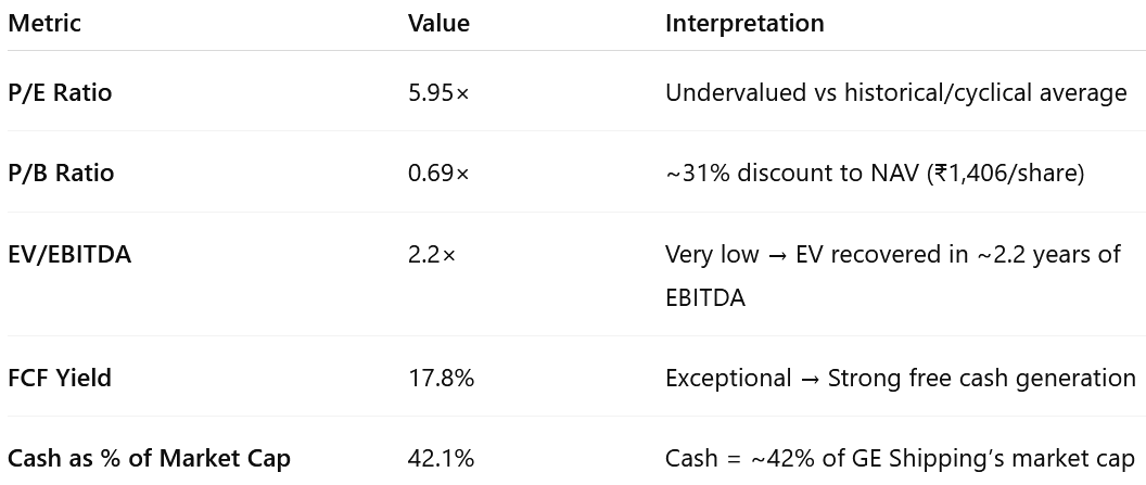 With cash equal to 42% of its market cap, EV/EBITDA at 2.2×, and FCF yield near 18%, GE Shipping offers rare value:
