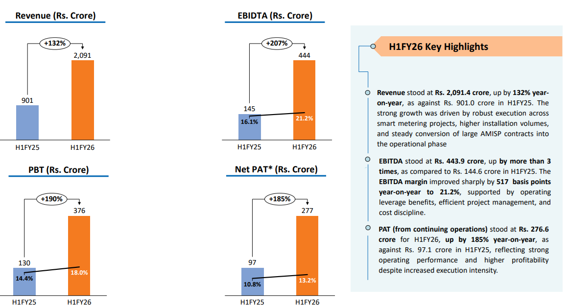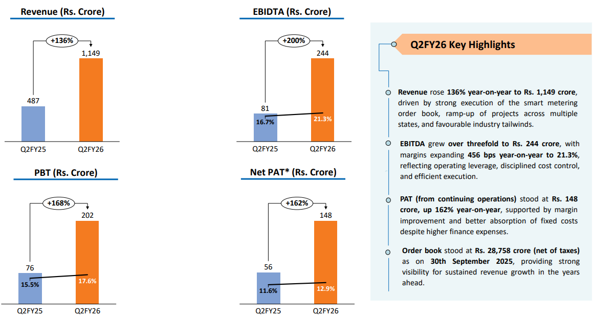 As on 30th September 2025, the company had a total order book of INR 28,758 crores (net of taxes) for about 3.6 crore meters for supply to utilities, other AMISPs and to the joint venture Platform.
