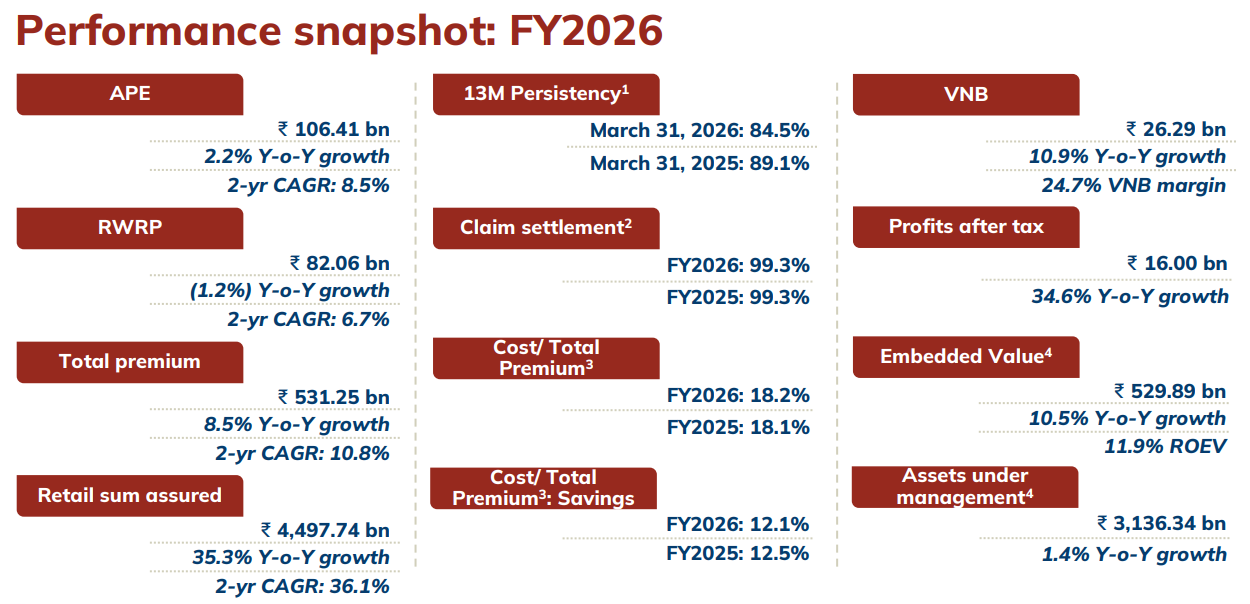 Retail protection is the key bright spot — retail protection APE grew 32.3% YoY to ₹7.91 bn, partly aided by GST reforms. This is the highest-margin segment and its growing share is structurally positive for VNB margins.