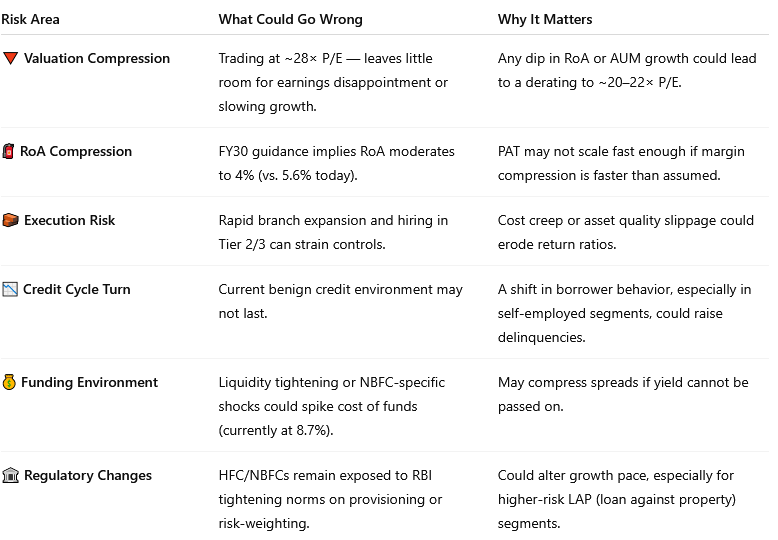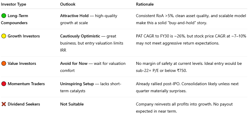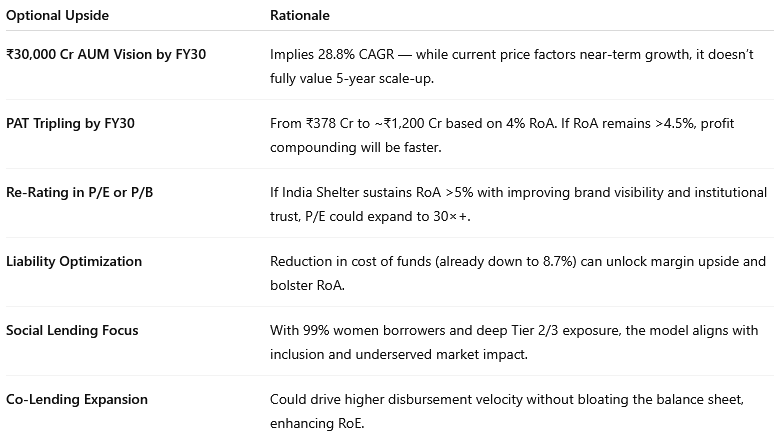 While near-term growth is priced in, the stock doesn’t yet reflect the full upside from FY30 PAT compounding, valuation re-rating, or co-lending led operating leverage.