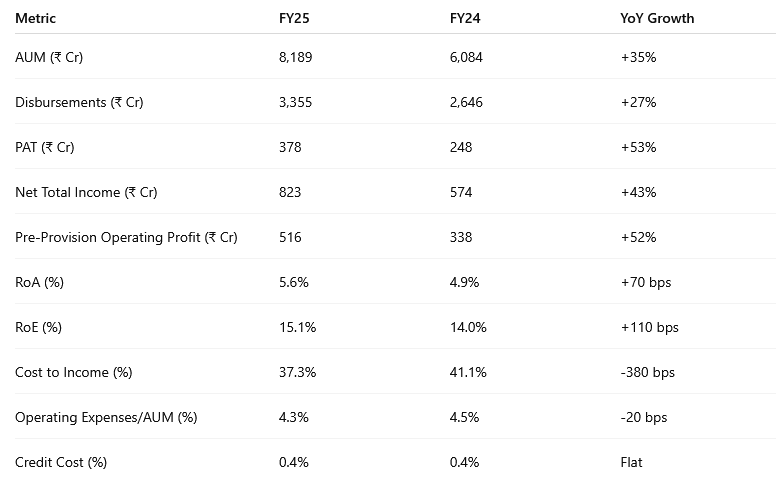 FY25 marked a breakout year for India Shelter, with >50% PAT growth and operating leverage playing out. Profitability improved due to rising scale, stable credit costs, and a 10 bps improvement in spreads to 6.2%.