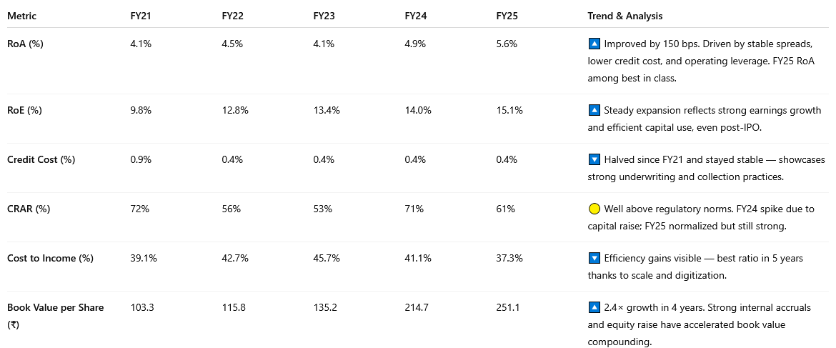 Structural Strength: RoA of 5.6%, RoE of 15.1%, credit cost at just 0.4% — signs of a clean, high-quality NBFC.