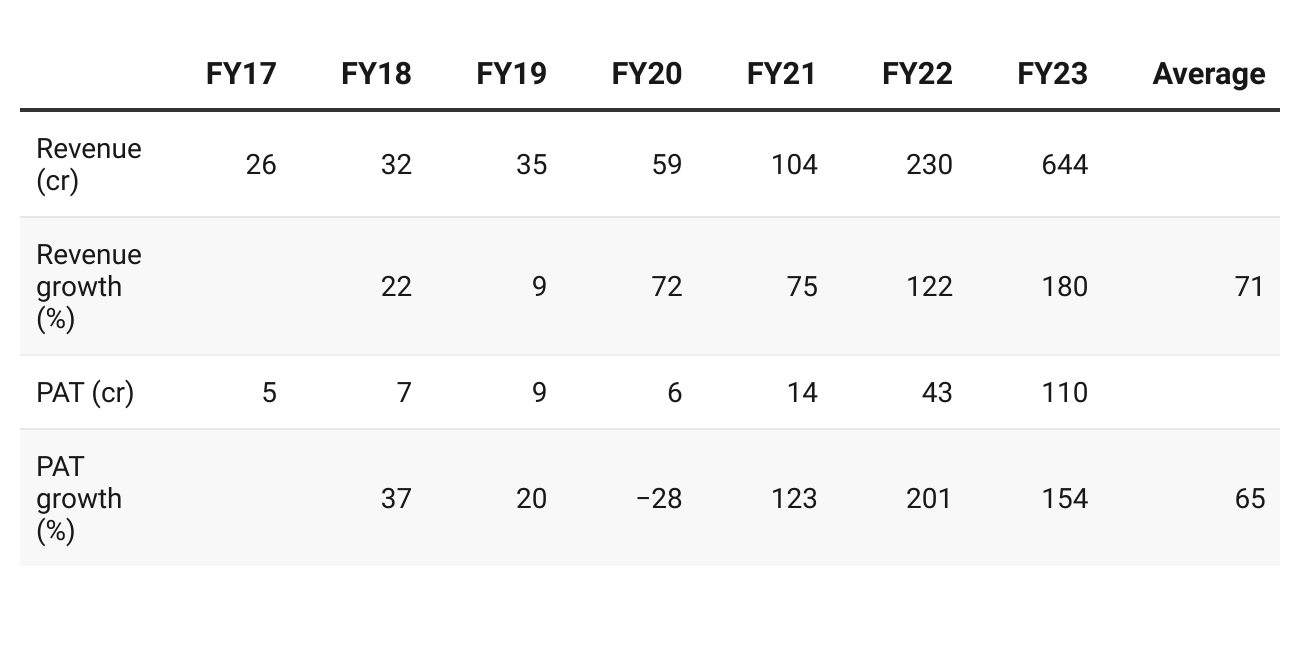 2. Revenue CAGR= 71%, PAT CAGR= 65% for FY17-23