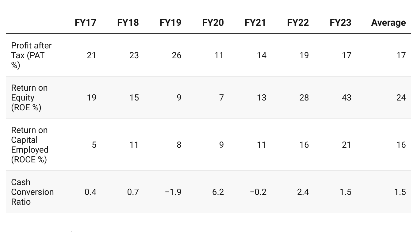 Return ratios are solid, consistent and improving over the last seven years. Most importantly returns are getting converted to cash.