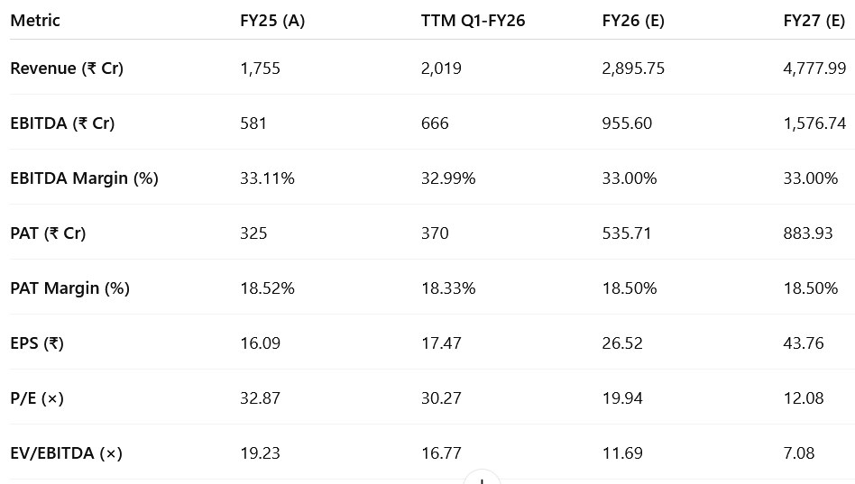 FY26 and FY27 Revenue, EBITDA, and PAT are based on management commentary and extrapolated growth trends.
