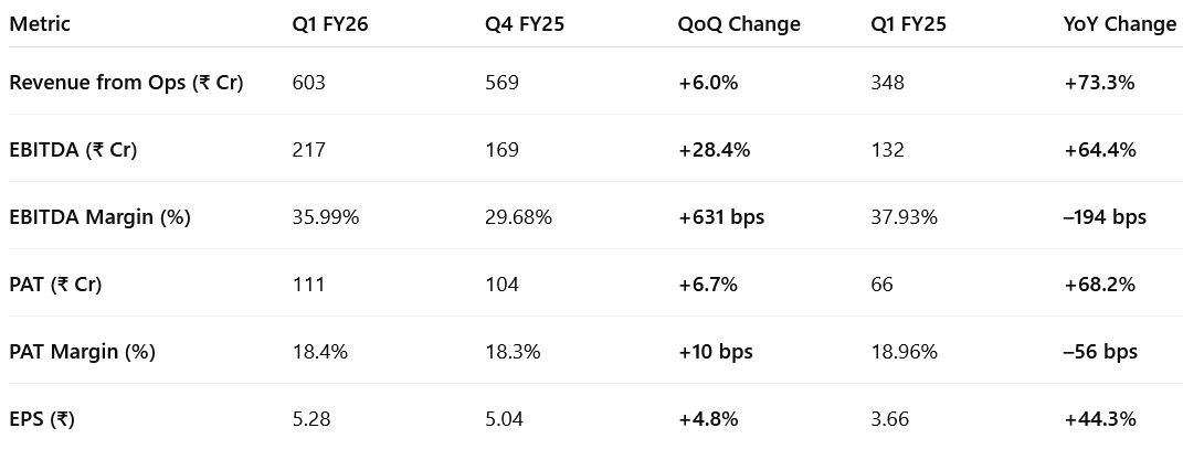 Profit growth: PAT up 49% YoY in Q1; margins steady (EBITDA ~33%, PAT ~18.5%) on strong execution.