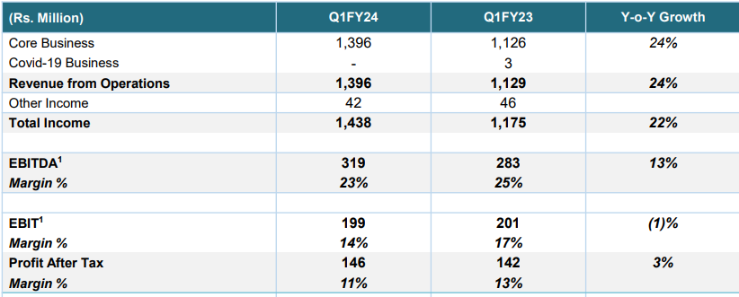 EBITDA margins were impacted in FY23 and Q1-24 due to investments for growth, however the management has guided for a 25% EBITDA margin. One needs to keep a watch that these margins hold.