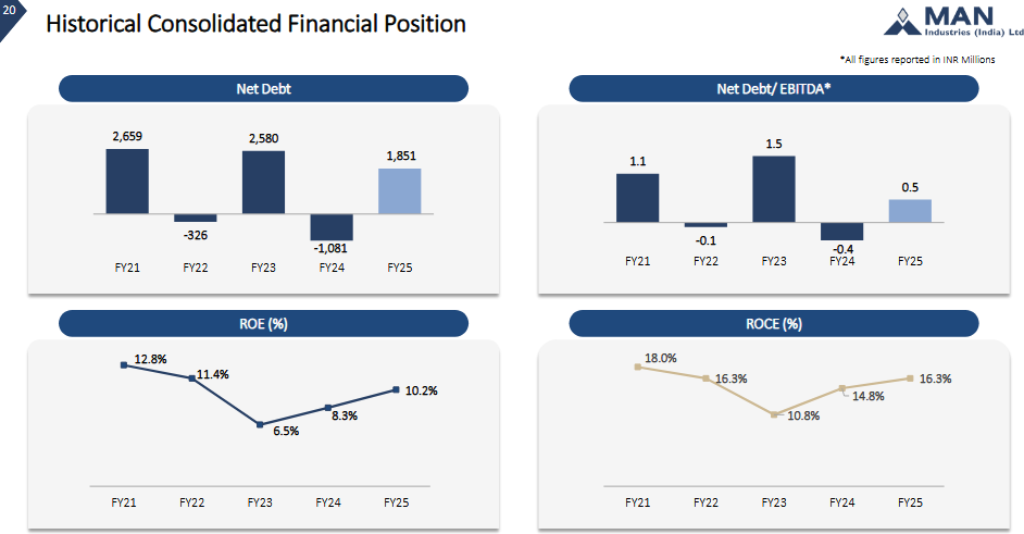 Man Industries has guided for an EBITDA margin of 10.4–10.9% in FY26. Assuming a conservative margin of 10.5% on projected revenue of ₹4,206.8 Cr, EBITDA could reach ₹441.7 Cr. This would mark a 25% increase over the FY25 EBITDA of ₹353.2 Cr, reflecting strong operating leverage.