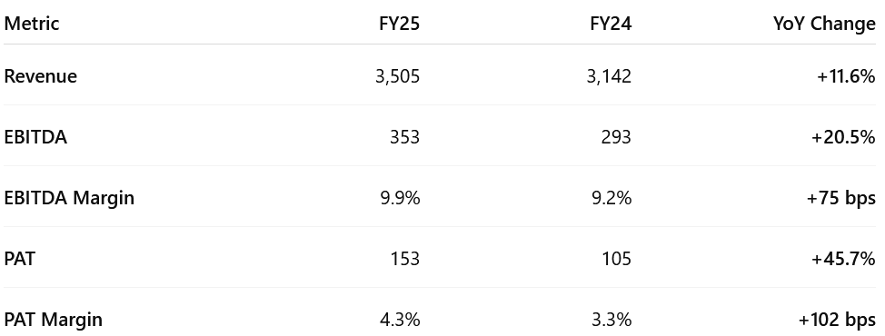 Revenue Beat: Delivered ₹3,505 Cr vs. ₹3,300 Cr guidance (up 11.6% YoY).