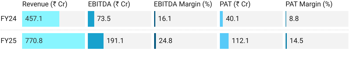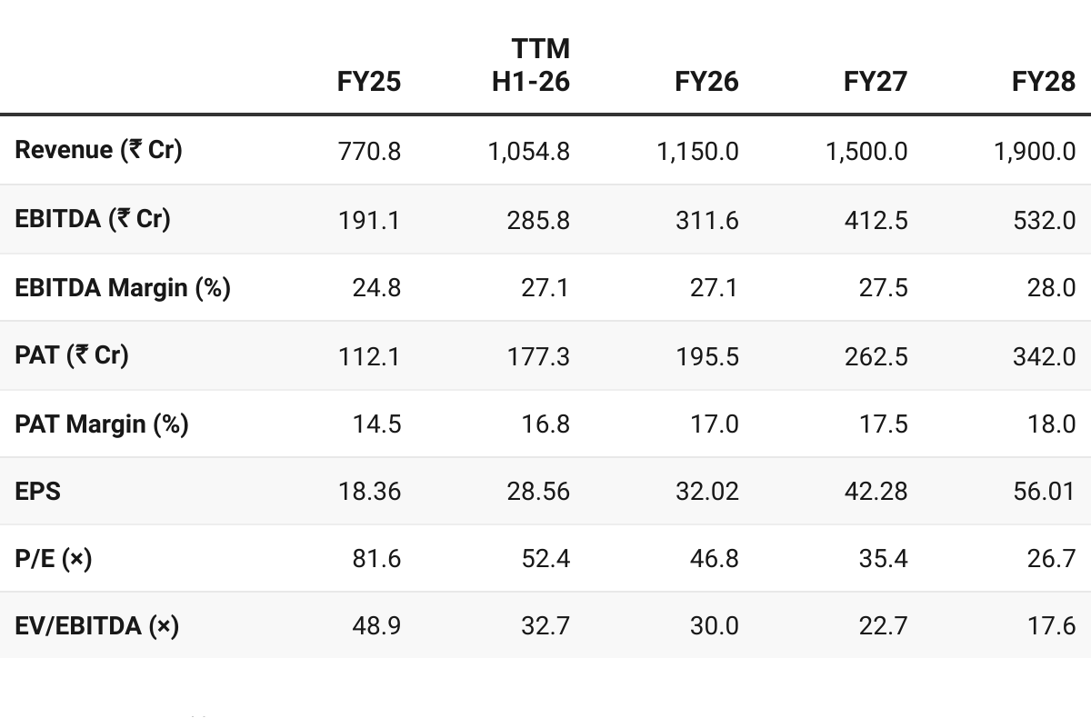 Revenue CAGR of 43% as revenue expected to grow from ₹1,150 Cr in FY26 to ~₹1,900 Cr by FY28