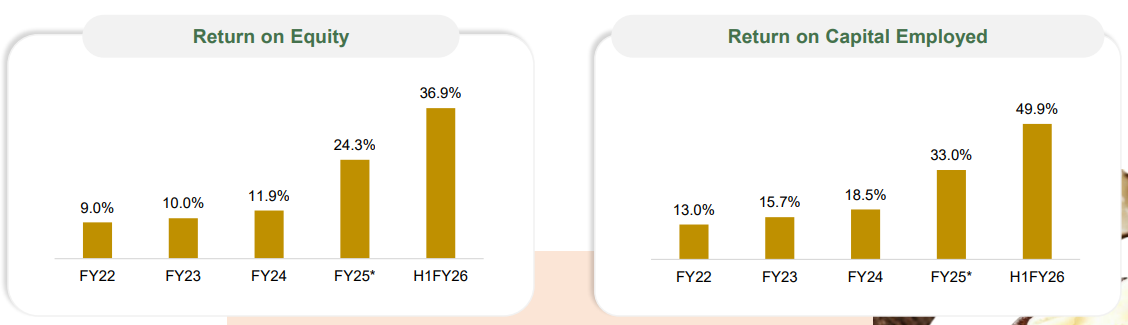 ROCE (36.9%) and ROE (49.9%) exceed long-term thresholds, signaling efficient asset turns and high return generation.