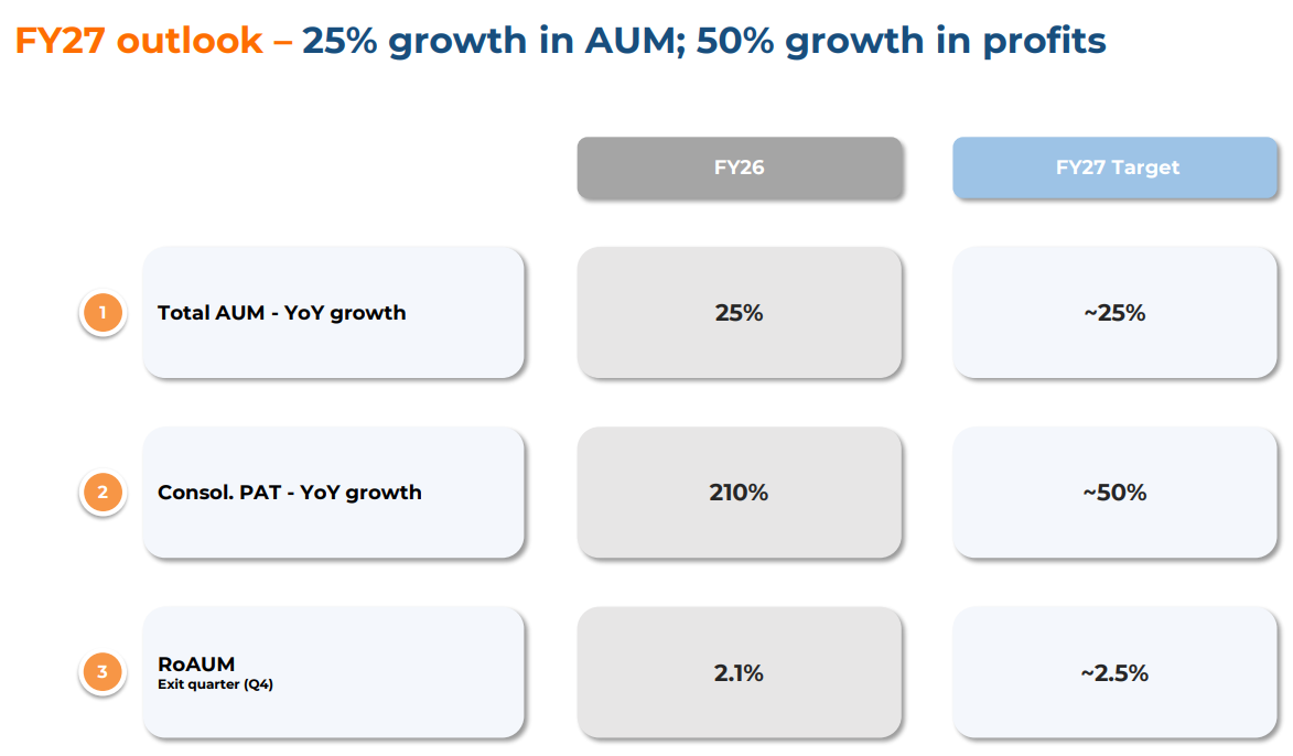 AUM growth: 22% AUM CAGR FY26-28 to support bottom-line growth