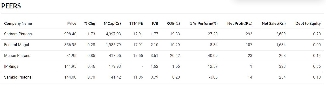 Largest manufacturer of pistons, pins, rings, and engine valves in India, a free cash flow compounder available at very reasonable valuations which are also cheaper to its smaller peers.