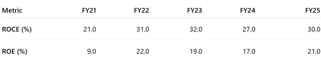 ROE/ROCE >30% by FY27 on margin improvement and low capital intensity.