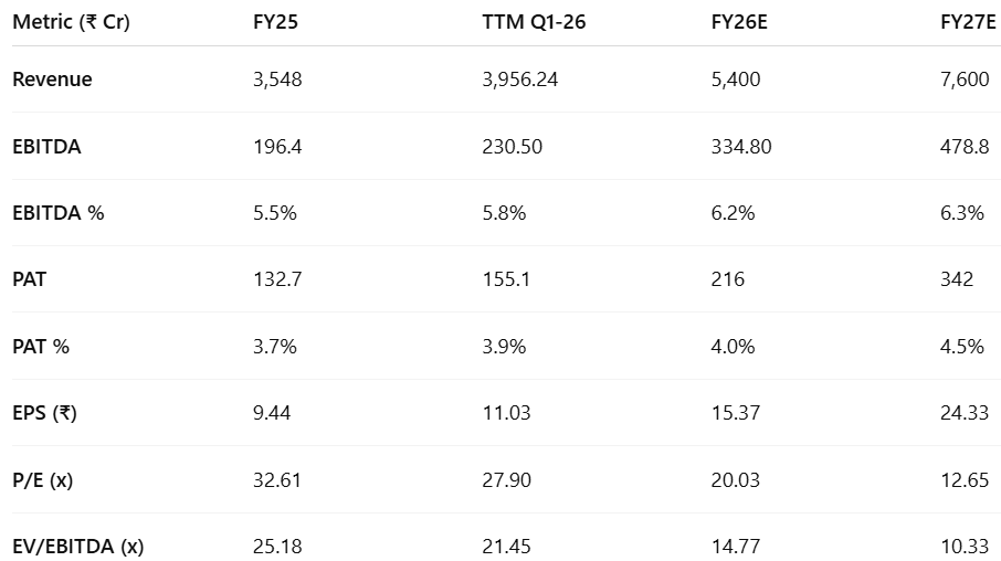 PEG ratio (P/E to earnings growth) looks favorable. PAT CAGR FY25–FY27 is ~59.5%, much higher than the P/E trajectory → stock could rerate as PAT expands.