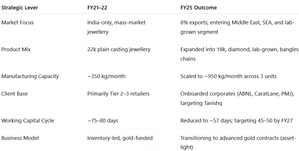 Working Capital Gains: ERP + bullion-supplied model cut cycle by 25%. Targeting 45–50 days by FY27 via gold metal loans and client mix shift.