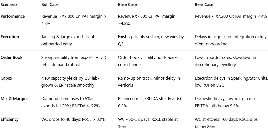 Sky Gold offers a moderate margin of safety, underpinned by high RoCE, strong earnings visibility, and improving efficiency—but much of the FY26 growth is partially priced in. Valuation expansion hinges on margin delivery, working capital gains, and successful integration of new verticals.