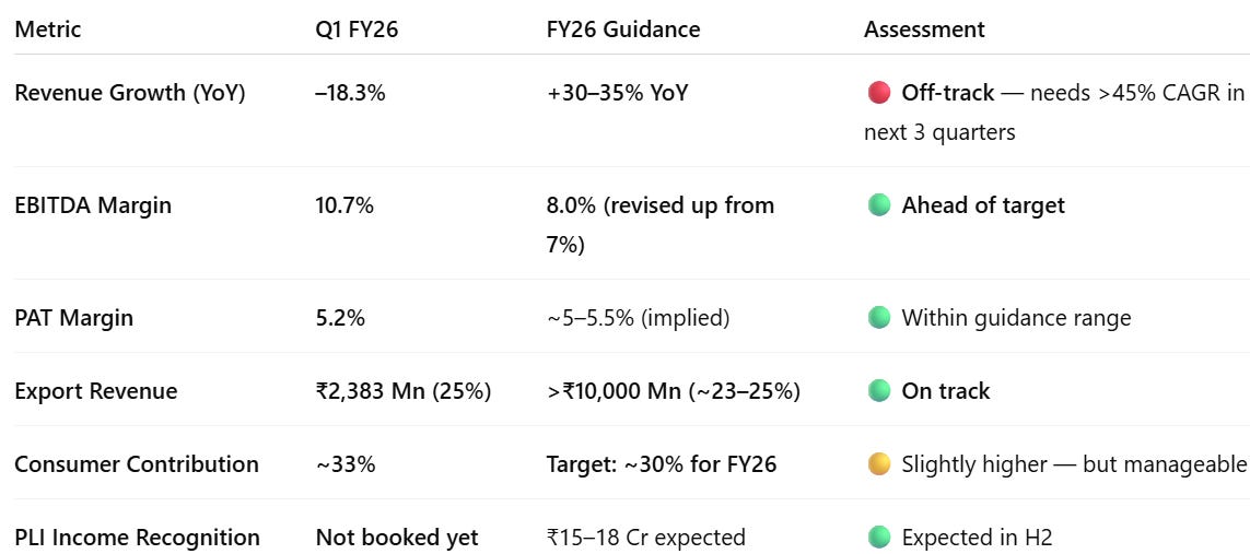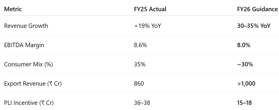 PLI Phase-Out: FY25 margins were partially supported by PLI (~₹36–38 Cr). With FY26 guidance lower (₹15–18 Cr), further tapering or exclusion from future tranches could pressure margins.