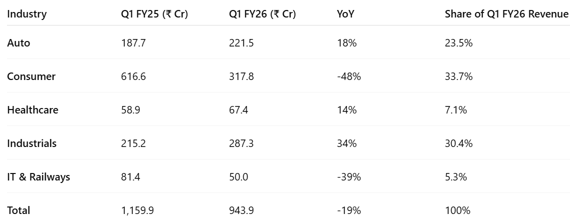 Business pivot underway: Consumer share reduced from 54% (Q1 FY25) to ~33% (Q1 FY26), replaced by high-margin verticals.