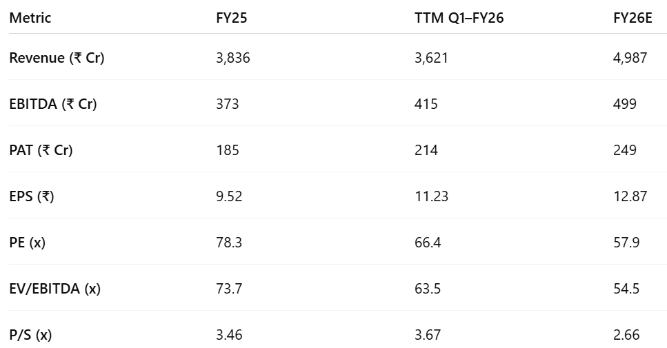 If FY26 execution (especially on revenue ramp-up and export momentum) is strong, current valuations can hold or even compress further without a price correction.