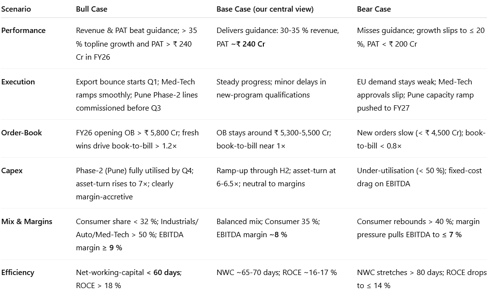 A good part of FY 26 delivery is already embedded. Execution visibility (₹ 5,300 Cr order book) and a clean balance-sheet help, but valuation leaves a relatively thin cushion if growth or mix disappoints.