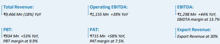 Balanced Growth: Revenue +19 % despite export softness; PAT +48 % on margin lift.