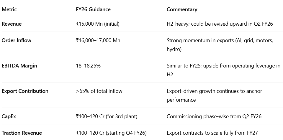 Outlook on ₹1,900–₹2,200 Cr revenue in FY27, with visibility from exports, traction, and motors.