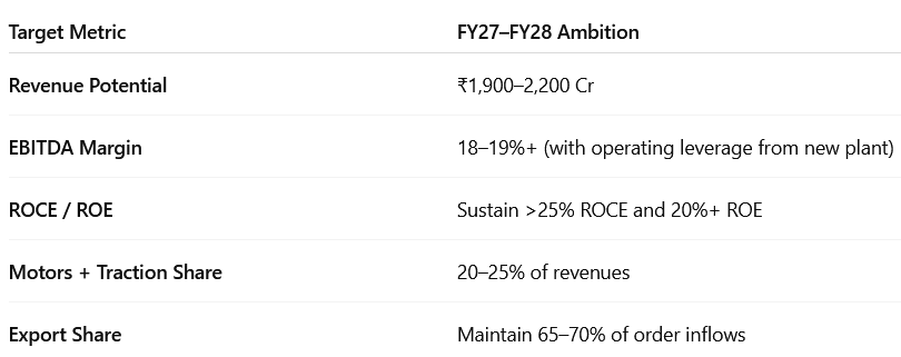 Revenue Growth: ₹2,200 Cr+ by FY27, driven by exports, traction motors, and new large generator segments