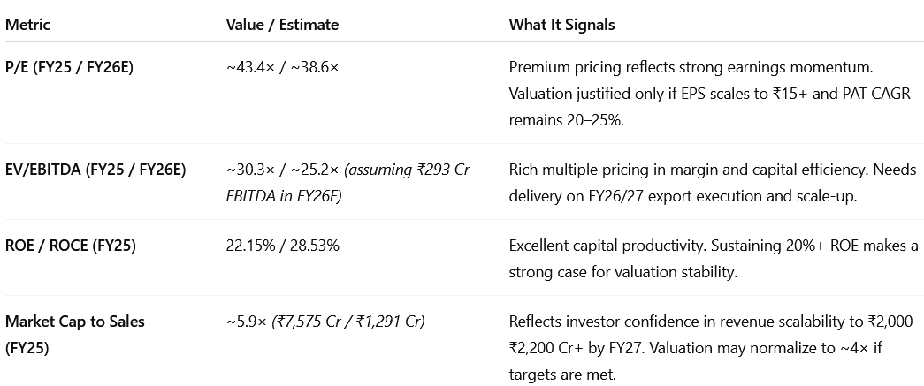 At ~43× trailing P/E, the stock requires FY27 PAT delivery to defend premium multiples. Any deviation from the ₹15–₹17 EPS path may trigger valuation compression.