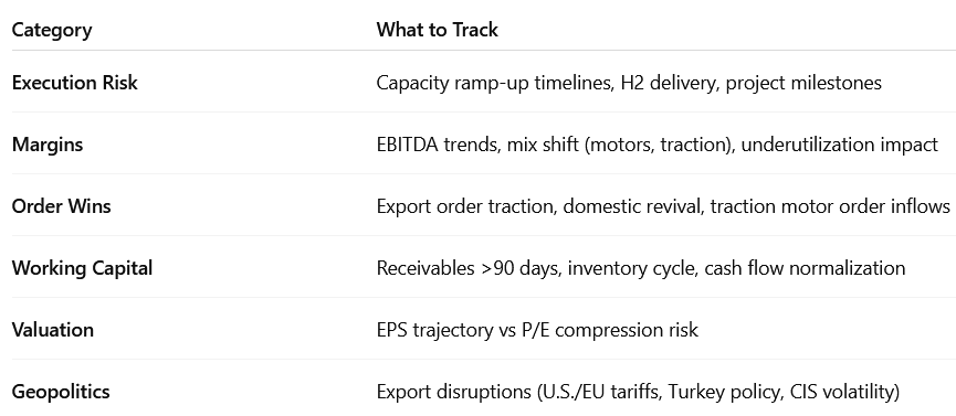 Monitor: Segment-wise margin disclosures, fixed-cost absorption from new plant, scaling timeline for motors/traction.