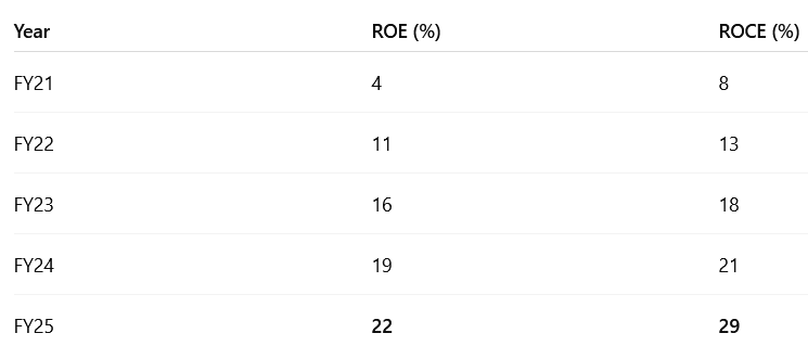 ROCE > ROE = Capital-Light Model — self-funded and not reliant on leverage to generate returns.