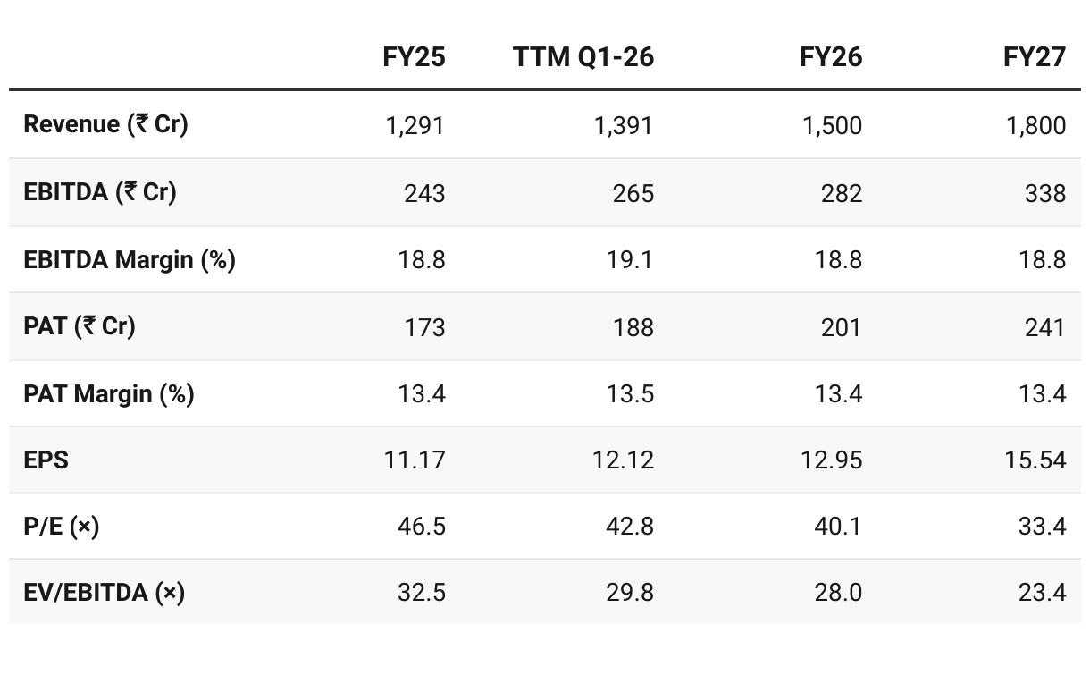 FY26: ₹1,500 Cr revenue, ~18% margin; upside possible.