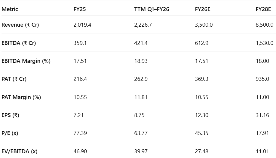 Valuation cooling off: P/E moderating from 77× in FY25 to ~45× in FY26E and ~18× by FY28E. EV/EBITDA compressing from 47× to ~11× over the same period, with earnings compounding rapidly.