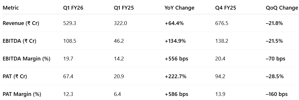 Execution-led margin expansion: PAT up 223% YoY in Q1 FY26; EBITDA margin improved to 19.7%, with PAT margin expanding to 12.3% — both above long-term guidance.