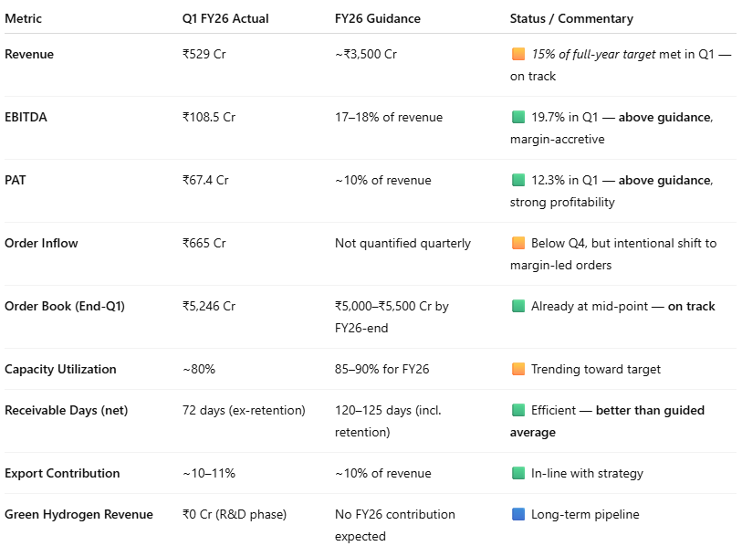 Order inflow variability: Q1 FY26 order inflow (₹665 Cr) was lower QoQ; though strategic, any sustained weakness or misjudgment in high-margin bidding could constrain forward revenue.