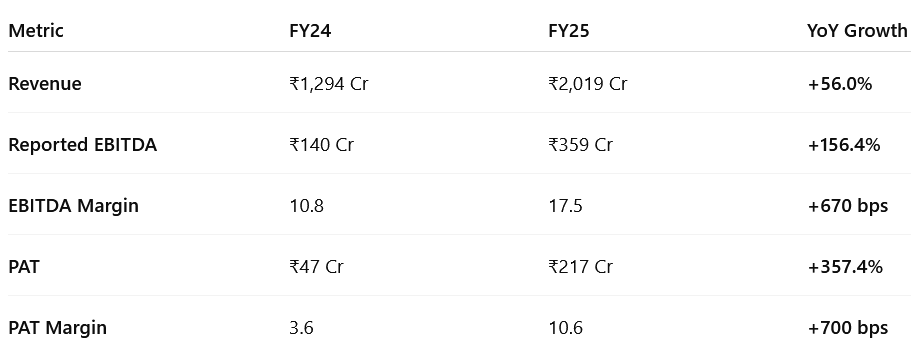 EBITDA and PAT more than doubled, with margins improving due to scale benefits, better product mix, and rising operational efficiency.